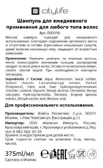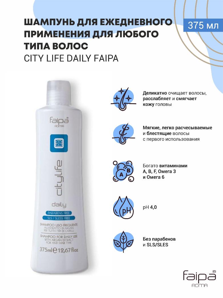 City life Daily Faipa мягко очищает волосы, расслабляет и смягчает кожу головы, воздействует на структуру локонов изнутри. Средство наполняет волосы жизненной силой, защищает их от возрастных изменений. Уже после первого применения волосы становятся мягкими, блестящими и легко расчесываются. pH 4,0. Без парабенов и SLS/SLES.