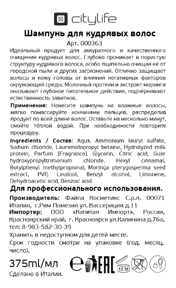 City life Curling Faipa бережно и эффективно очищает волосы от пыли и других загрязнений, проникая глубоко внутрь волосяного волокна. Помогает поддерживать необходимый уровень влаги, предотвращает спутывание, разглаживает кутикулу и возвращает волосам силу и блеск. Создает защиту для кожи и волос от неблагоприятного воздействия факторов окружающей среды. После первого применения волосы заметно становятся мягкими, шелковистыми, а локоны упругими. Наполненные жизненной силой, волосы долго удерживают объем и форму прически, становятся более густыми. Ослабленные и тонкие волосы получают дополнительную энергию и заметный объем. Эффект усиливается при каждом мытье. pH 4,0. Без парабенов. Без SLS/SLES.