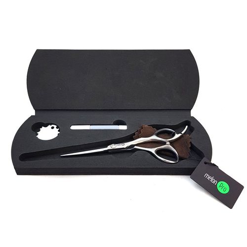Ножницы парикмахерские silver edition филировочные 38 зубцов эргономичные 6,0 Melon Pro подходят для учеников или начинающих мастеров. Выполнены из стали 420C с твердостью 56-58 HRC по японской технологии. Заточены под углом 42 градуса вручную, конвексным подходом. Полотна соединены винтом, регулируемым с помощью специального ключа. В комплект поставки входит чехол с необходимыми для обслуживания ножниц аксессуарами.